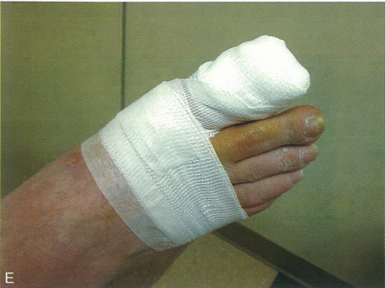 将近侧的甲上皮瓣翻回原位,是否缝合视情况而定。用非黏性辅料覆盖暴露的趾骨,用纱布包扎