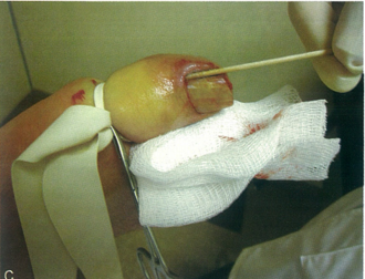 此时非手术治疗仍有治愈可能。采取消除对所有指趾的压迫,每天温水浸泡4-5次,10-15分钟/次;留取分泌物培养,,开始使用光谱抗生素,症状减轻后采取指(趾)甲下填塞法。