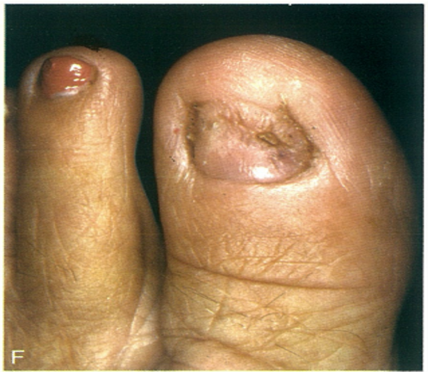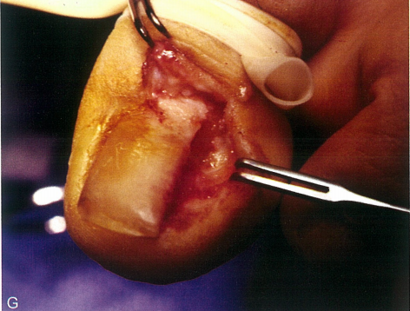 由于甲上皮的覆盖已被翻开,并且甲板的深面已脱离甲床,轻轻移去这部分趾甲,暴露下面的甲床,用小刀切除暴露的甲床。