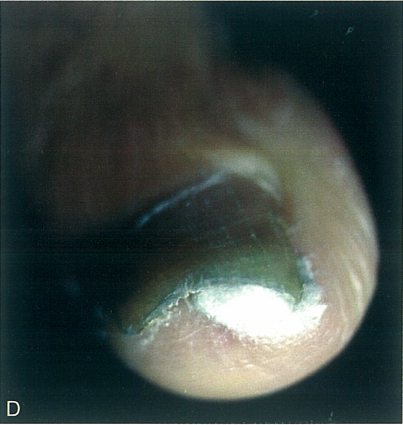 Ⅳ期(慢性嵌甲型甲沟炎形成期):由于反复多次拔甲,甲面积明显减少,两侧甲周有色素沉积,慢性嵌甲型甲沟炎形成,或出现“螯钳”样趾甲