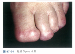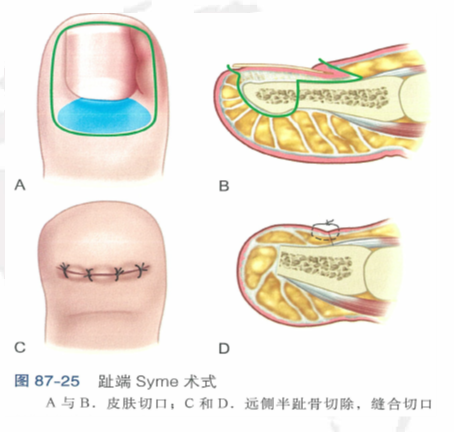 趾端Syme手术包括截去远节趾骨的远侧半部,包括甲板、甲床、甲襞和位于上述结构深面的骨组织。此术式推荐用于成人患者,伴有嵌甲反复发生感染,而且采用较保守的手术方法无效。它也可用于远节趾骨和趾甲的各种骨或软组织肿瘤。