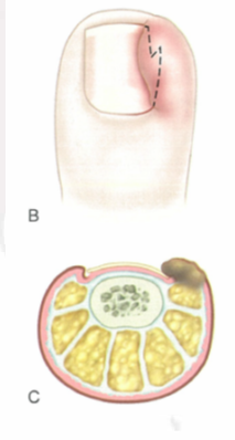 ·于足趾侧方中线附近,距趾甲侧缘4-5mm处,通过一椭圆形皮肤切口做楔形组织切除;