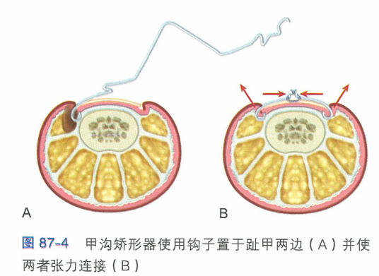 一种动态矫正技术,甲沟矫形器(orthonyxia),直接把趾甲的甲角抬起,解除了炎性软组织的压力。甲沟矫形器包括在张力下连接趾甲两侧的钩形臂(图87-4),其材质可以是金属材料、“超级弹性”材料或形状记忆材料。报道指出,大部分病人经过3周以内的治疗即可纠正趾甲畸形。动态矫正技术相对于手术治疗优势在于减少了术后发病率,恢复时间更短,美容效果更好。