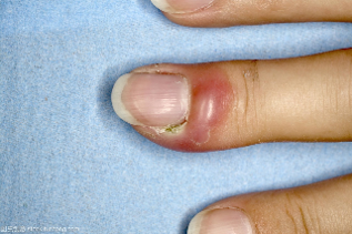 4、手指甲沟炎 多因刺伤、针扎伤、拔倒刺等引起。