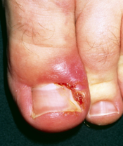 Ⅱ期(炎症期):指(趾)有较明显的变形,疼痛持续加重,有血清样或脓性分泌物排出,有时有臭味。有少许肉芽增生,分开甲周组织可显露侧甲缘。