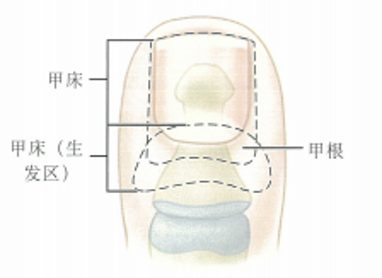 指(趾)甲复合体:由甲板、甲床和周围皮肤组成。