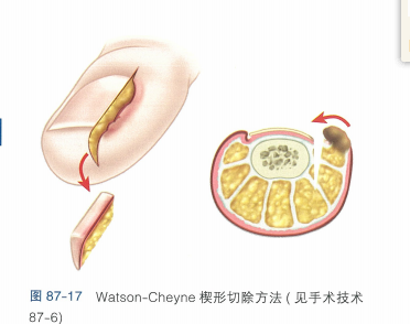 ·在皮肤上从甲襞外侧4mm到甲襞,做一个椭圆形标记,保证甲襞可见;·完全切除甲板与所有肉芽组织;·楔形切除标记的椭圆形皮肤与皮下组织,楔形的尖端应达到皮下;·估计边缘的缺损成都,外翻甲襞以减少它的凸起度,椭圆的宽度与外翻的程度与甲襞本身的大小决定。