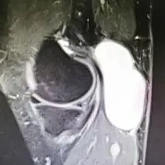 如下图所示,核磁共振显示腘窝囊肿与关节腔不相通,与血管、神经相邻的囊肿,可选择开放手术,降低神经、血管损伤的风险。