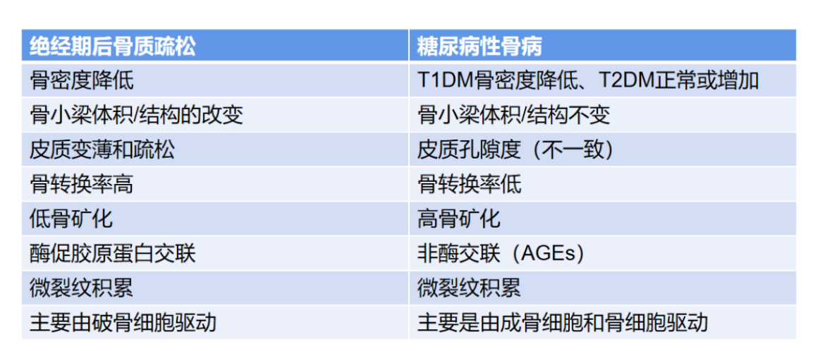 表1.绝经后骨质疏松症与糖尿病骨病的骨特征差异