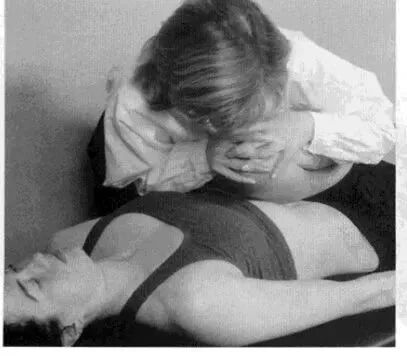 - 2、骶骨被动后伸和内旋试验:患者呈侧卧位,患侧向上。检查者一手放于髂骨前部髂前上棘的位置,另一只手放在髂后上棘的位置,手指和手掌放在髂骨后部和骶骨上。