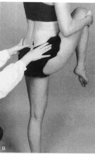 骶髂关节外伤后,髋关节的运动也会受到影响。当患者最大限度的屈曲一侧的髋关节时,检查者应该观察髋关节运动的范围,是否有疼痛以及髂后上棘的活动。检查者应该注意在髋关节屈曲前,双侧的髂后上棘是否在同一水平上。