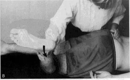 通过屈曲和内收髋关节获得骶髂关节的‘滚动”效果,若正确地做此项检查,膝关节应朝向对侧肩关节。此时可以触及骶结节韧带并确定是否有压痛。若骶髂关节部位疼痛,则表明该检查阳性。做此试验时必须小心,因为这会大大增加髋关节和骶髂关节的应力。