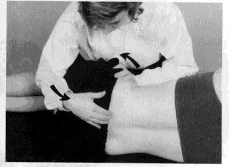 - 1、同侧俯卧运动试验:这个试验的目的是检查骶骨屈曲或向侧方或向后方旋转的能力。患者呈俯卧位,检查者拇指放于髂后上棘上,另一手的拇指平行放于骶骨上,让患者主动后伸,检查侧髋关节。