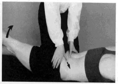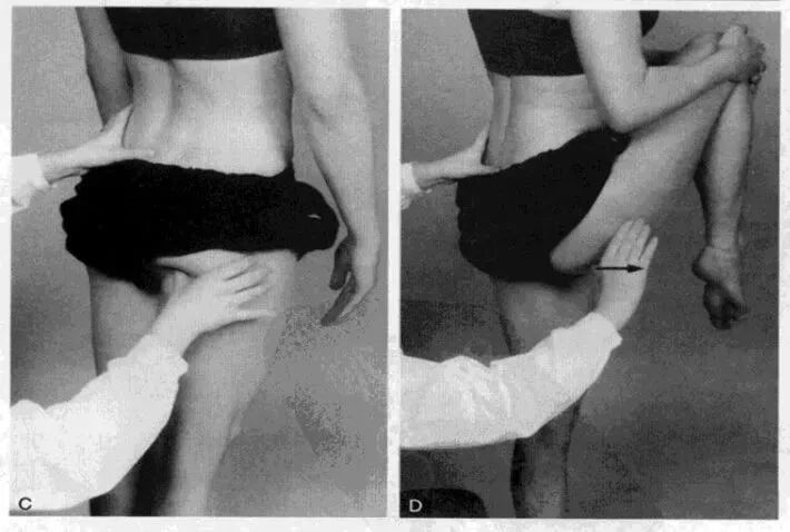 检查者放在髂前上棘上的手向前拉髂骨,放在髂后上棘的手向前推髂骨,此时检查者可以感觉到髂骨相对于骶骨的活动。