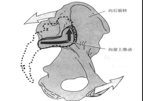 当一个人由仰卧起身站起的时候,情形是一样的。当一侧髋关节伸直的时候,同侧髋骨会向前旋转。在髋骨向前旋转(后伸)时,其会沿着长轴向后滑动,同时沿着短轴向下滑动。
