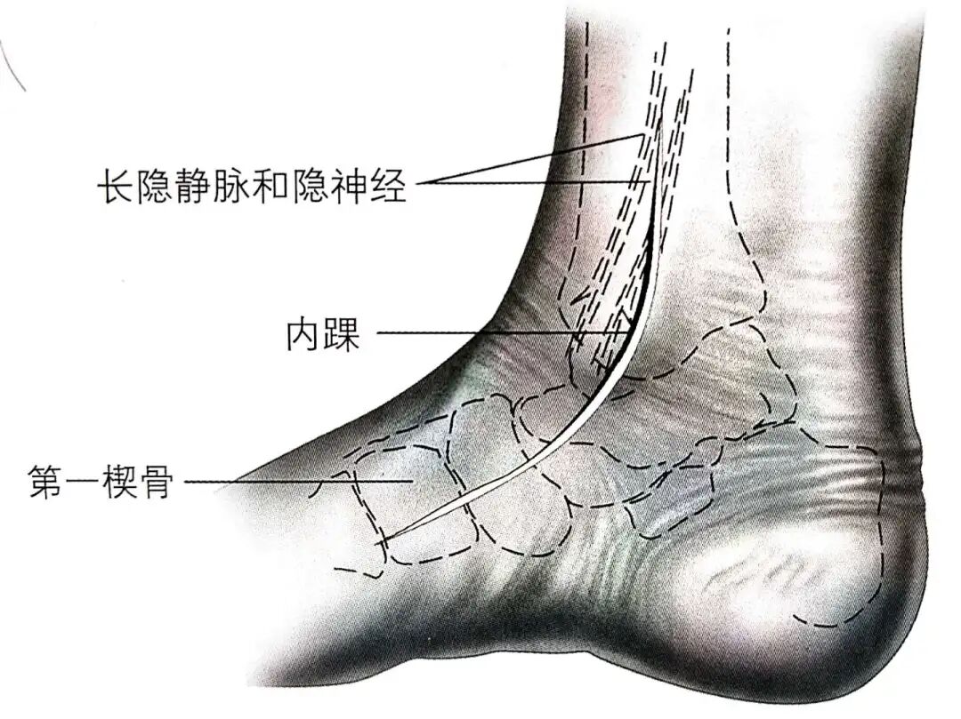 - 在内踝与大隐静脉平行的正上方切开。由前向后弧形切开,以便于显示前内侧关节。或者,可以在内踝的中心处做一个纵向切口,远端指向距骨颈。