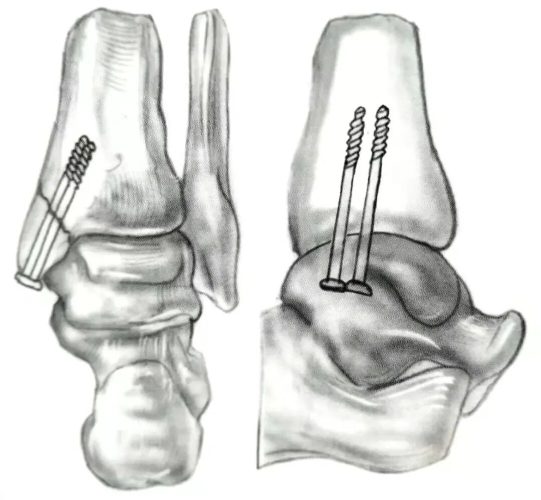 b:侧位。注意用2枚4mm的空心螺钉固定这些骨折的常用方法。螺纹部位放置在胫骨干骺端,不横穿骨折部位