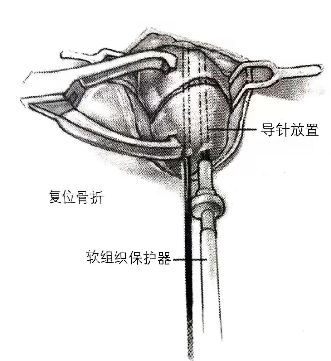 - 从4mm空心螺钉组中平行钉入2根小直径克氏针,垂直于骨折部位。第3根克氏针置入可用于在螺钉放置期间保持旋转稳定性。