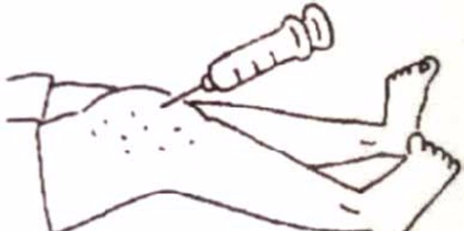 (2)对于没有关节积液的病人,采用髌骨外下缘(外侧膝眼)穿刺法,一定要定好位置(屈膝90度位,髌骨下缘、髌韧带外侧1cm处),采用8号针头,与胫骨平台平行,向内呈45度角,针头完全刺入,有一种落空感,有时回抽会抽出关节液,此时可放心注射;回抽如没抽出关节液,可以注射玻璃酸钠,如果注射时比较轻松,那就没有问题,如果注射时比较费力,病人感觉痛、胀,可以进一步向里面插下针头,左右移动下,注射时比较轻松,病人无不适即可再注射。只要熟练操作,定位正确,及时调整,病人很少出现注射后不适的。