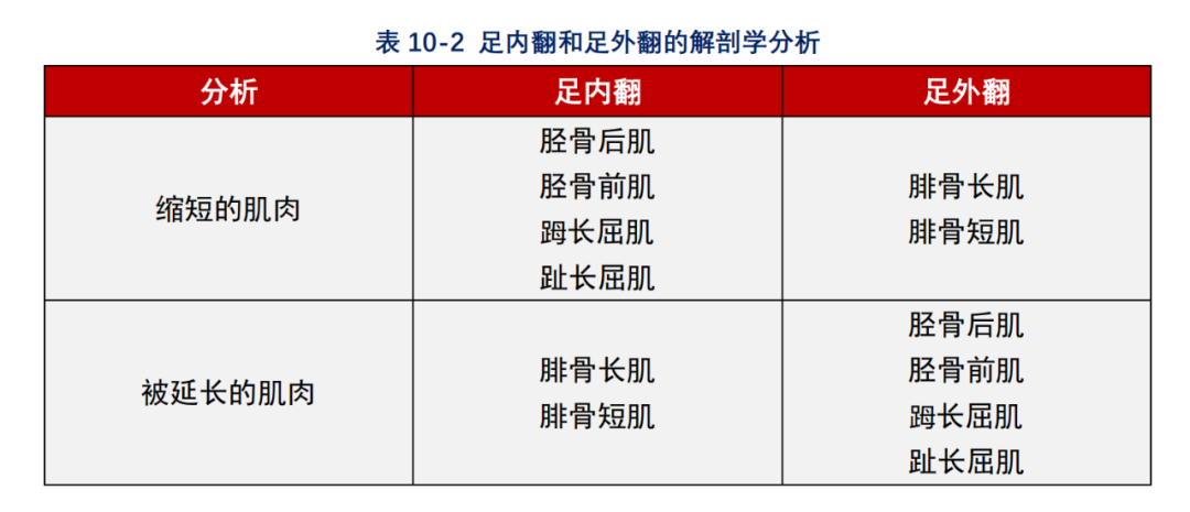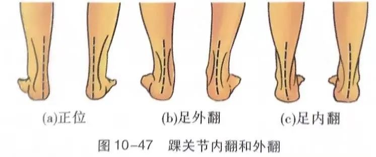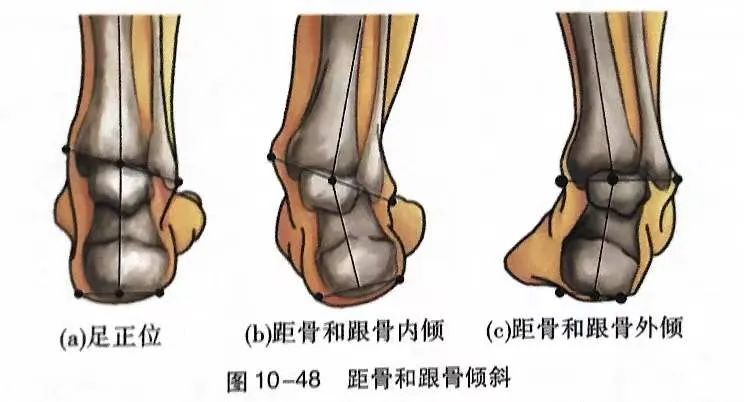 · 解剖学分析:1.足外翻时(图10-47b),距骨和跟骨向内侧倾斜(图10-48b),内踝位置较正常位置时高,外踝位置则较正常位置时低,可能提示屈肌和胫骨前肌延长,腓骨长肌和腓骨短肌短缩。2.足内翻时(图10-47c),距骨和跟骨向外侧倾斜(图10-48c),内踝位置较正常位置时低,外踝位置则较正常位置时高,提示腓骨长肌和腓骨短肌延长,胫骨后肌、长屈肌、趾长屈肌和胫骨前肌短缩(表10-2)。