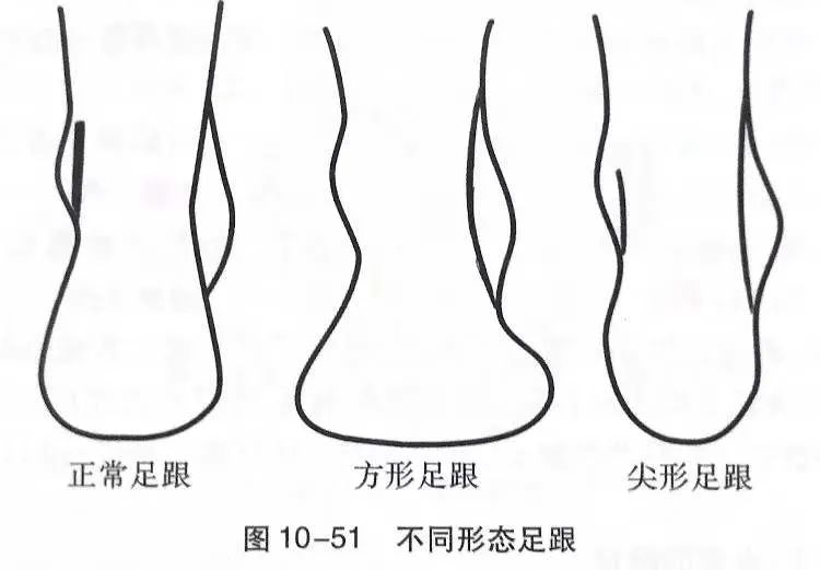 · 解剖学分析:正常足跟形状为圆形,若观察到方形足跟,提示身体重心后移;若观察到尖形足跟,提示身体重心前移(图10-51)。