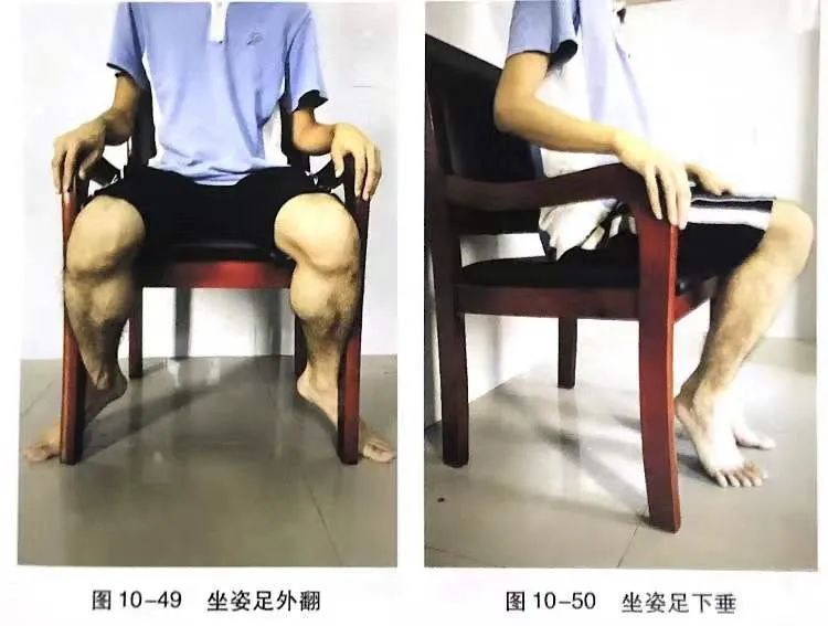▶ 坐姿时:评估踝关节· 评估方法:观察或询问受检者,是否在坐姿时将双脚盘旋在座椅脚上(足外翻)(图10-49)或足下垂(图10-50)。