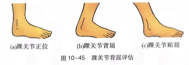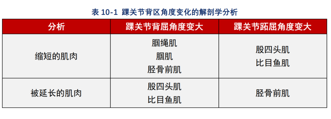· 解剖学分析:踝关节背屈角度增加(图10-45b),其原因可能是站立时膝度屈曲,或胫骨前肌短缩;踝关节背屈角度变小(图10-45c)其原因可能是股四头肌短缩(膝关节过伸)(表10-1)。