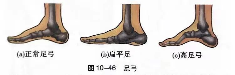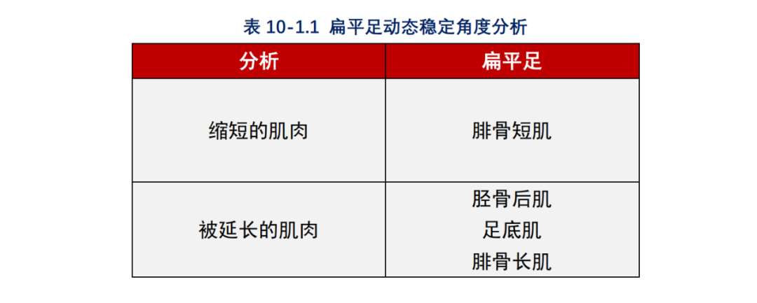 · 解剖学分析:从动态稳定角度分析,扁平足提示胫骨后肌、足底肌延长,腓骨长肌、腓骨短肌短缩(图10-46b,表10-1.1);高足弓提示足底肌短缩(图10-46c)。