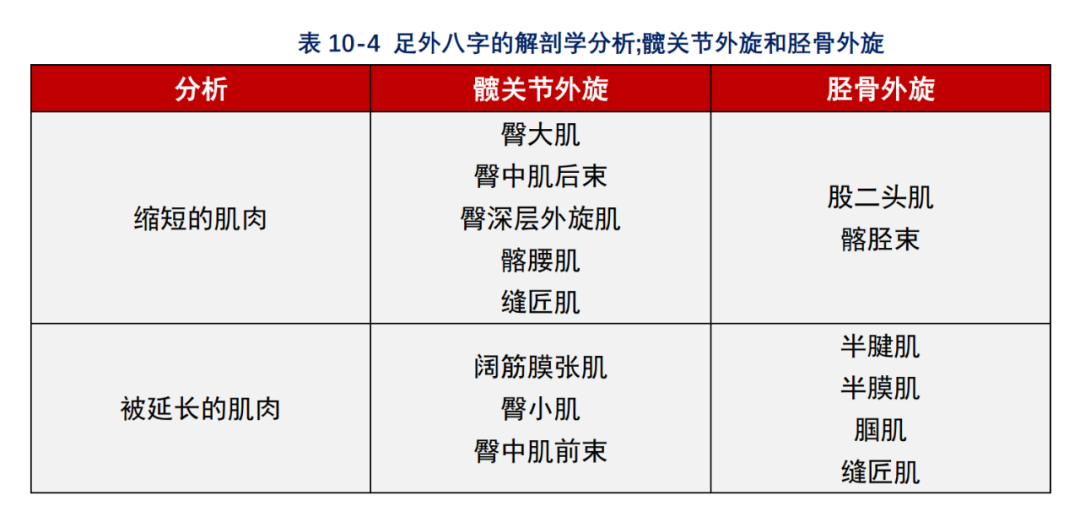 · 解剖学分析:由后方观察,观察的足背外侧范围越大,其足部朝外旋的程度也越大(外八字);反之,为内八字。足的位置与髋关节、胫骨的位置有关。足部内八字站立,提示髋关节内旋和(或)胫骨内旋;足部外八字站提示关节外旋和(或)胫骨外旋(表10-3,表10-4)。