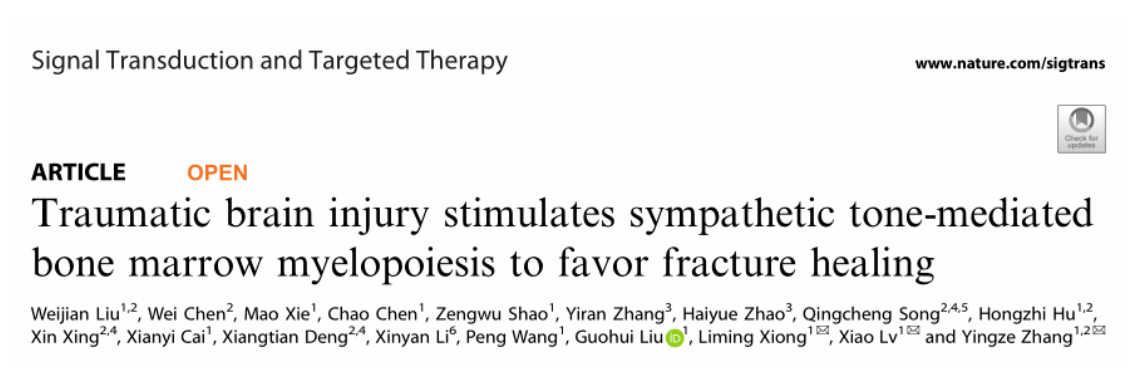 2023年7月5日,华中科技大学附属协和医院张英泽/吕潇/刘伟健在《Signal Transduction and Targeted Therapy》在线发表了题为 “Traumatic Brain Injury Stimulates Sympathetic Tone-mediated Bone Marrow Myelopoiesis to Favor Fracture Healing”的研究型论文。该研究首次揭示了交感神经介导的神经免疫在TBI促进骨折愈合中的重要机制,为骨折延迟愈合/不愈合提供了新的潜在治疗靶点。