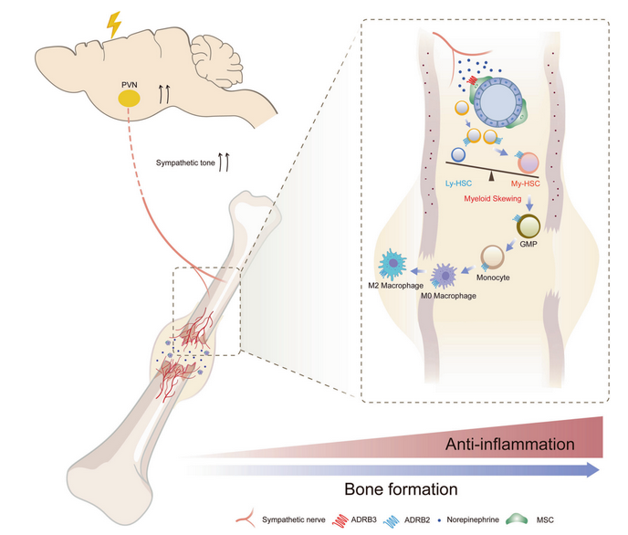 骨髓为造血干细胞(HSC)和骨髓间充质干细胞(bMSCs)提供了独特的微环境。HSC来源的破骨细胞和bMSCs衍生的成骨细胞通过持续的骨重塑活动来维持骨骼稳态介导。中枢神经系统(CNS)在调节外周器官的活动中发挥关键作用。中枢神经系统和免疫系统之间的长期相互作用使神经系统能够精确调节骨髓中的免疫环境。值得注意的是,交感神经可以通过调节HSC的扩增来应对创伤等生存压力。在骨折愈合的初始阶段,HSC产生多种免疫细胞并迁移到骨折间隙,介导血肿和骨痂的形成。临床实践发现,合并创伤性脑损伤(TBI)的骨折患者其骨折愈合速率显著加快,然而CNS损伤与TBI后骨愈合加速之间是否存在直接的神经免疫调控机制目前尚不清楚。