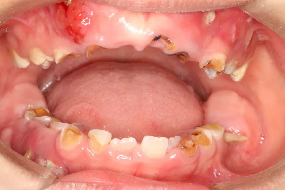 这是一名4岁男孩瑞瑞的口内照片,从照片里面可以看出,瑞瑞几乎全口都是蛀牙,大部分牙齿仅剩残冠。