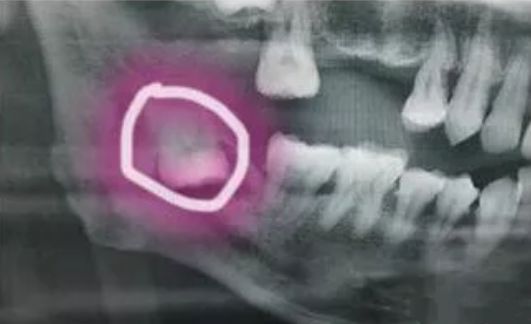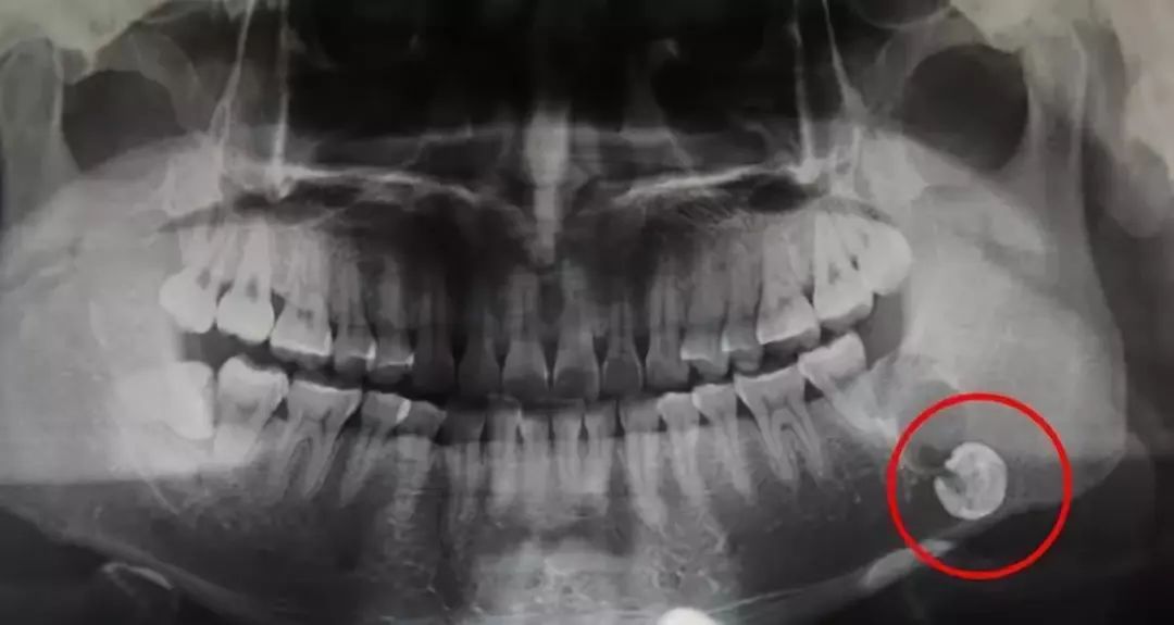 医师表示,由于患者的智齿位置深,朝舌向倒置生长,紧贴下牙槽神经管,而且舌侧骨壁薄弱,当地医生拔牙时可能没注意,并且这颗智齿的位置一直伴随着颌骨的运动而改变。