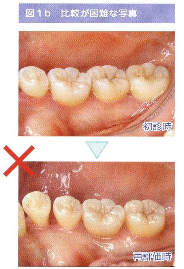 用同样的标准去拍摄,就可以看出其中的变化和个人差别(图1a)。如果拍摄的倍率、部位以及角度没有统一,就很难与之前的状态进行比较(图1b)。