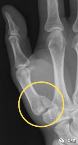 最常见的损伤机制是部分弯曲的掌骨承受轴向负荷。手的这个区域可能有软组织损伤。 - Bennett 骨折的放射学特征是什么?