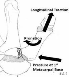 闭合复位也可以通过弯曲拇指 MCP 关节并在手掌和尺骨方向对 TM 关节施加压力来获得。