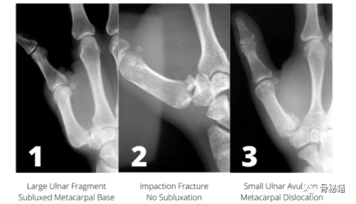 1.大的尺侧骨块与基底的半脱位2.压缩的骨折块无半脱位3.小的撕脱骨折块和脱位