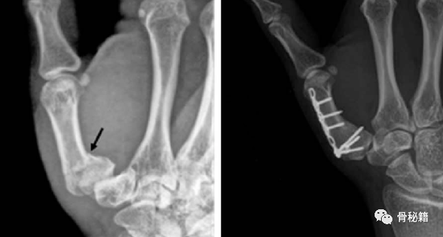 - 复位:骨折复位技术应包括拇指旋前,以帮助解剖复位掌骨至尺骨碎片。如果尝试闭合复位后关节间隙仍超过 2 mm,则应考虑切开复位。