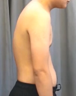 动作要领:测试者赤裸上身,原地踏步5步,保持身体放松,然后双脚并拢。治疗师从侧面观察测试者脊柱曲度。先观察胸椎段看测试者胸椎是否变直,是否过度后凸;然后观察测试者腰椎段,看腰屈是否变大或变小。