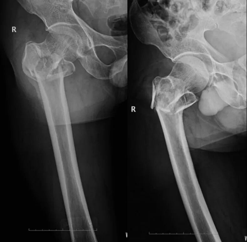 体格检查:右髋部软组织肿胀明显,右股骨粗隆处压痛明显,患肢短缩、外旋畸形,活动受限。