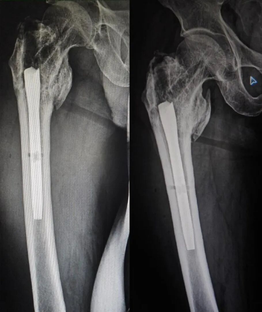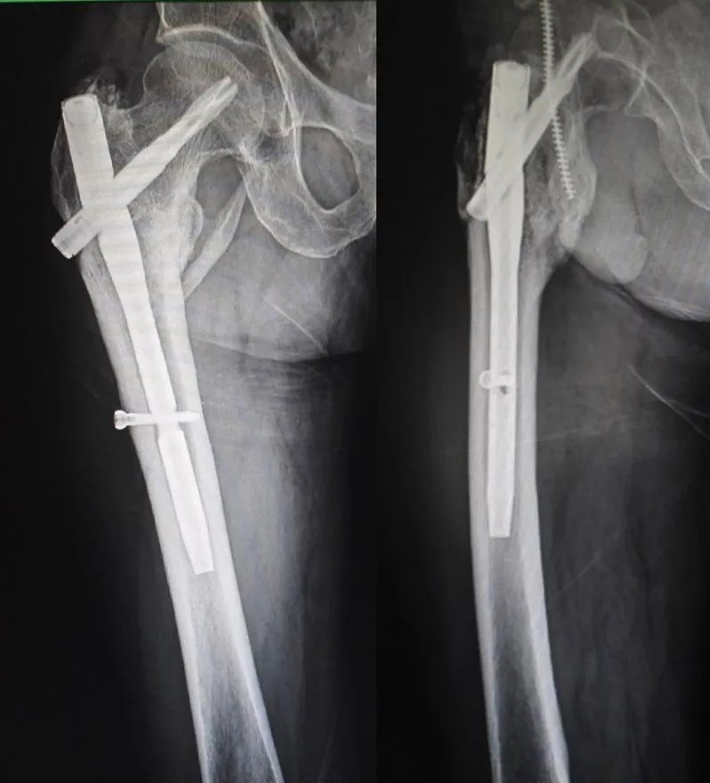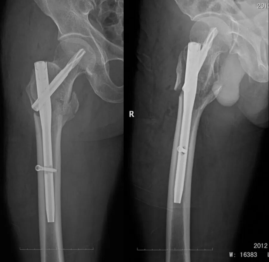 治疗经过:入院后行持续右下肢骨牵引,牵引五天后行 PFNA 内固定术。