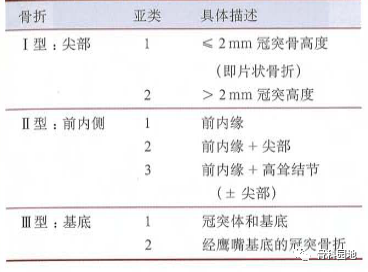 Ⅲ型:单独或粉碎性骨折,累及50%以上的冠状突。