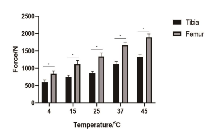 结果:股骨假体固定后的推出力高于胫骨平台假体,并且随着假体温度的升高,骨水泥固定后的推出力也呈线性增加,胫骨和股骨内假体水泥的孔隙率随温度的升高而降低。