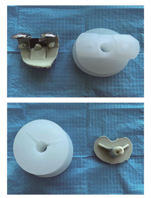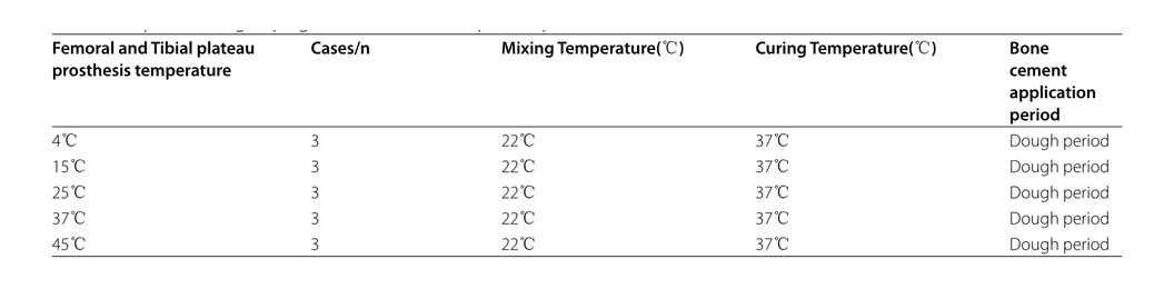 骨水泥主要是由粉末聚甲基丙烯酸甲酯(PMMA)共聚物和液体甲基丙烯酸甲酯(MMA)单体组成的双组分体系。聚合过程分为四个阶段:混合、等待、加工和硬化。植入后的硬化阶段可持续数周。不理想的水泥技术和应用可导致无菌性松动,这是种植体失败的主要原因之一。因此,探索合适的条件来降低种植体松动率是必要的。我们通过改变假体的温度来考虑一个新的角度,看看是否对水泥固定强度有影响。本实验设计不同温度梯度的股骨假体和胫骨平台假体,用聚丙烯树脂基与骨水泥粘合,模拟术中粘合,通过测量模型凝固后的推出力来评估骨水泥的固定强度。