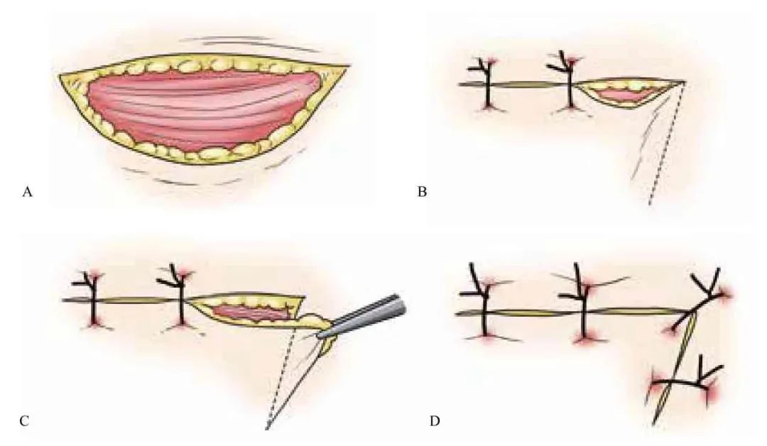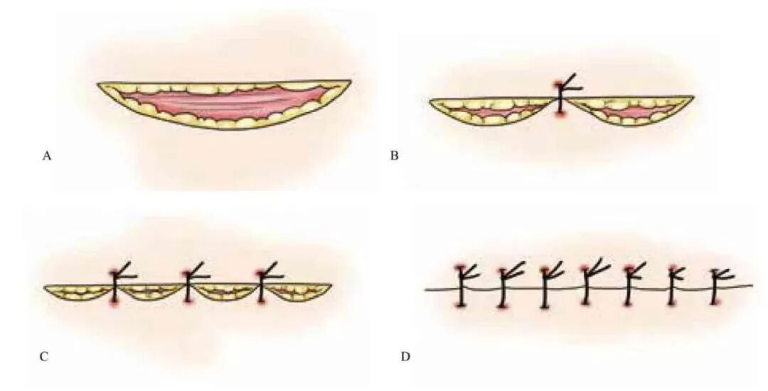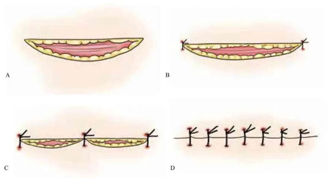 A. 伤口松弛状态下,下缘长于上缘;B. 缝合伤口中部,C. 随后缝合两侧伤口的中部,D. 关闭伤口