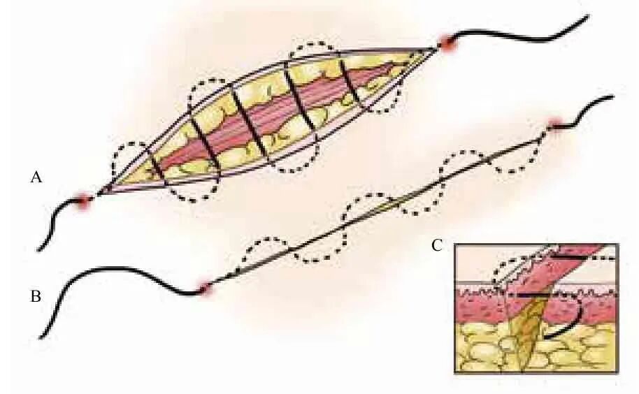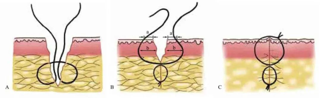 A. 将缝合线结埋于组织深处;B. 皮肤间断缝合,需注意避免死腔,皮肤缝合时进针方向远离伤口边缘,C.打结后形成小山丘形