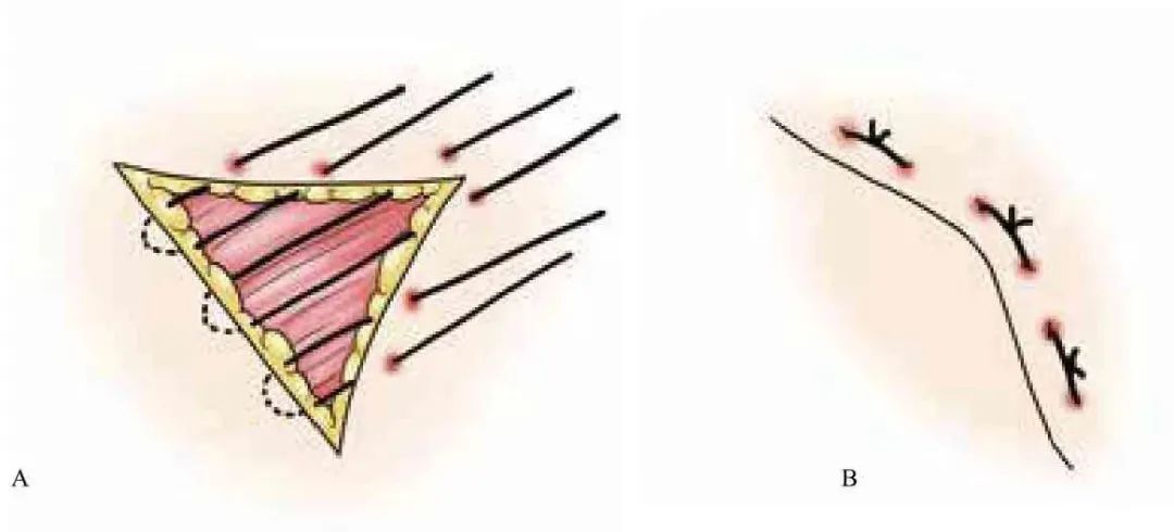 11-2-7 类三角形不规则伤口的处理A. 伤口修剪为钝角三角形后;B. 伤口沿钝角朝向方向缝合