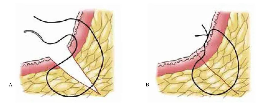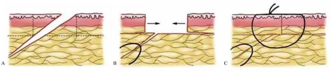 图11-2-5 向下的斜行切口A. 修整皮缘(否则缝合后皮缘不易对齐,软组织堆积);B. 缝合皮下组织后,游离皮缘(在皮下脂肪层游离)后;C. 缝合皮肤