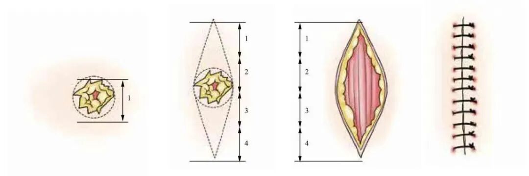 2. 通过皮肤切除和皮肤移动可以使具有深度的伤口边缘达到相同水平(图11-2-5)。