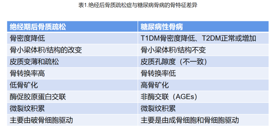 表1总结了糖尿病骨病和绝经后骨质疏松症之间的差异比较。然而,需要注意的是随着糖尿病患者的衰老,骨质疏松症引起的骨改变可能会叠加在糖尿病本身引起的骨改变上,从而进一步导致其骨脆性增加和骨折的倾向。